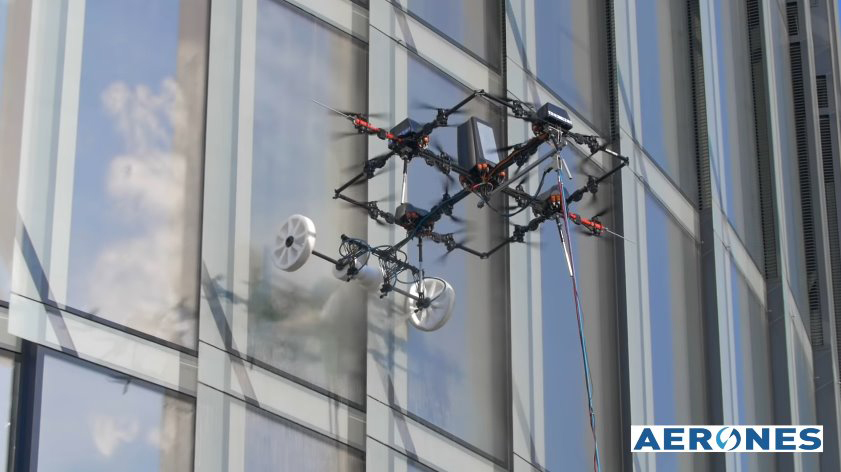 След създаването на дронове за поддръжка на вятърни турбини, латвийската фирма Aerones, представя специален дрон за почистване на прозорци във високи конструкции. Според разработчиците, новото устройство е в състояние да почисти фасадите на сградите 20 пъти по-бързо от алпинистите.