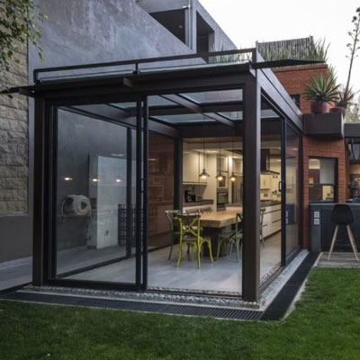 Екипът събаря няколко стени, за да отвори дома към въздуха и светлината, и добавя нови конструкции с големи остъклявания от всички страни. Инсталиран е нов тънък и издаден напред покрив, който осигурява защита от лошото време и придава на къщата вид на въздушен градински павилион.