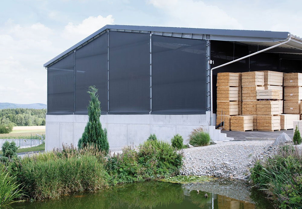 Текстилната олекотена конструкция предлага решение, като дава възможност за ефективно затваряне на големи фасадни отвори. Електрически или ръчно задвижваните сгъваеми фасадни елементи и ролетните врати от фолио предлагат икономични и удобни алтернативи на конвенционалните варианти за отвори на врати и проходи. Международната компания Huesker Synthetic GmbH със седалище в Северен Рейн-Вестфалия е специализирана в производството и разработването на иновативни системи за врати и фасади, изработени от технически текстил. Под името Tectura Huesker предлага различни решения за индустриални приложения.