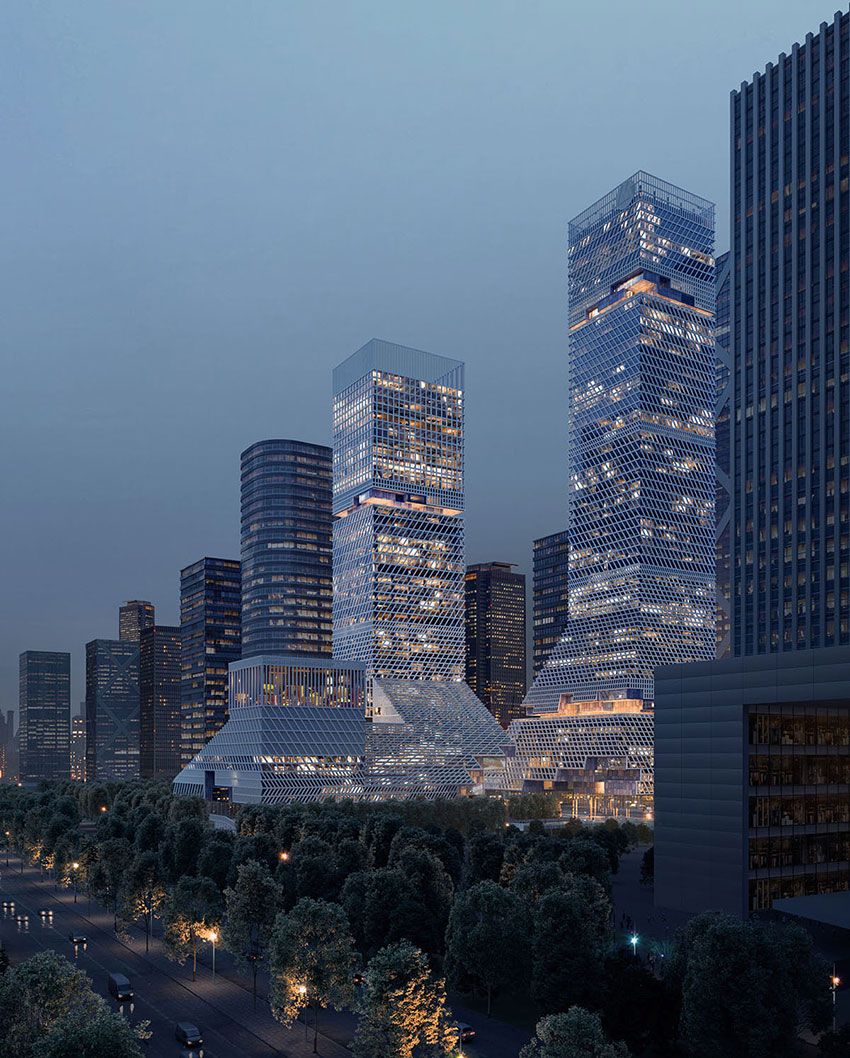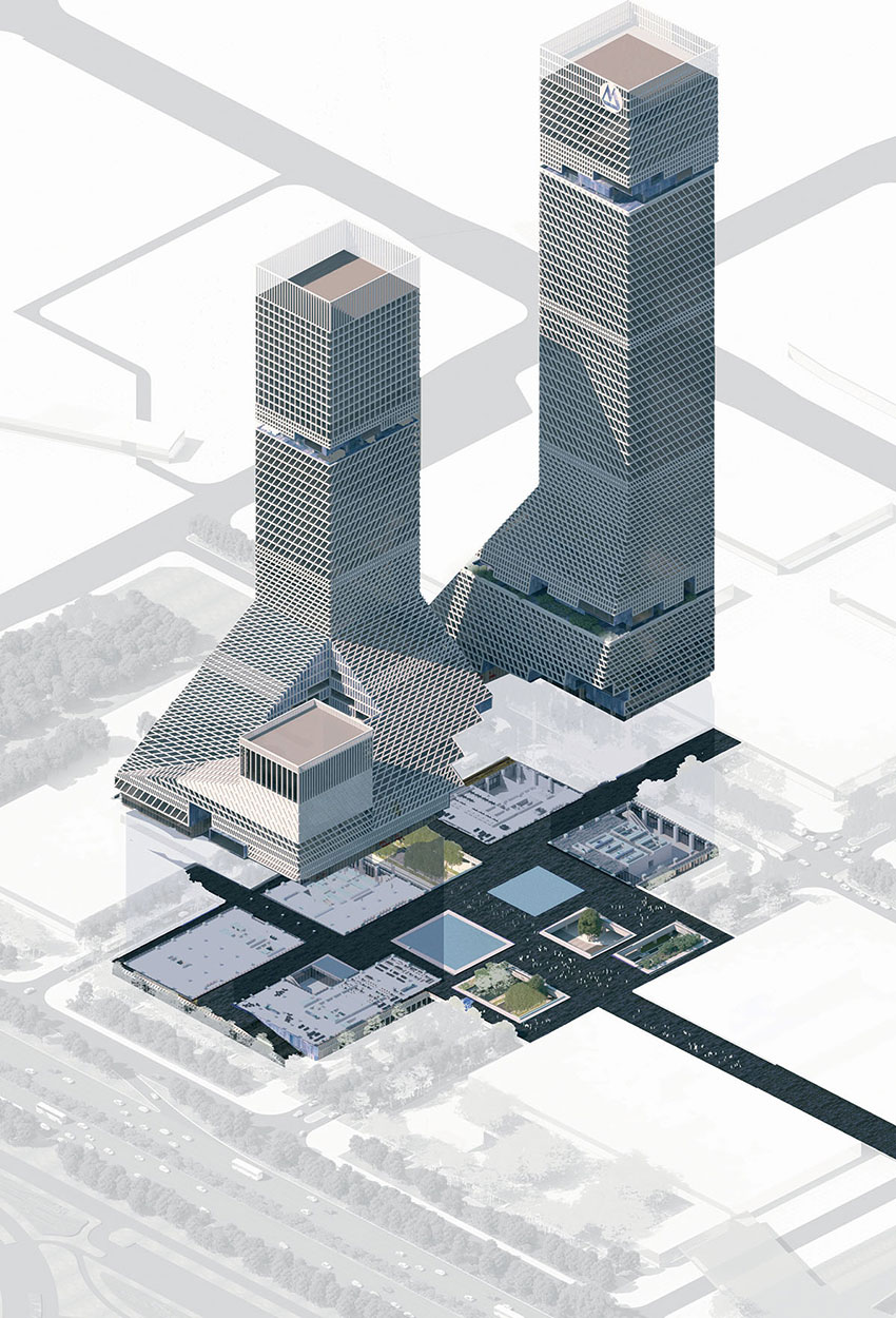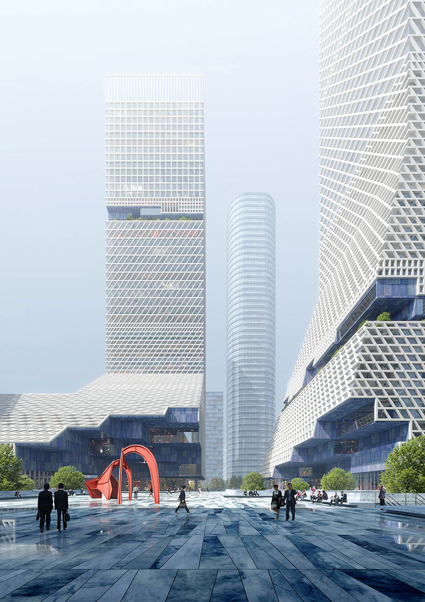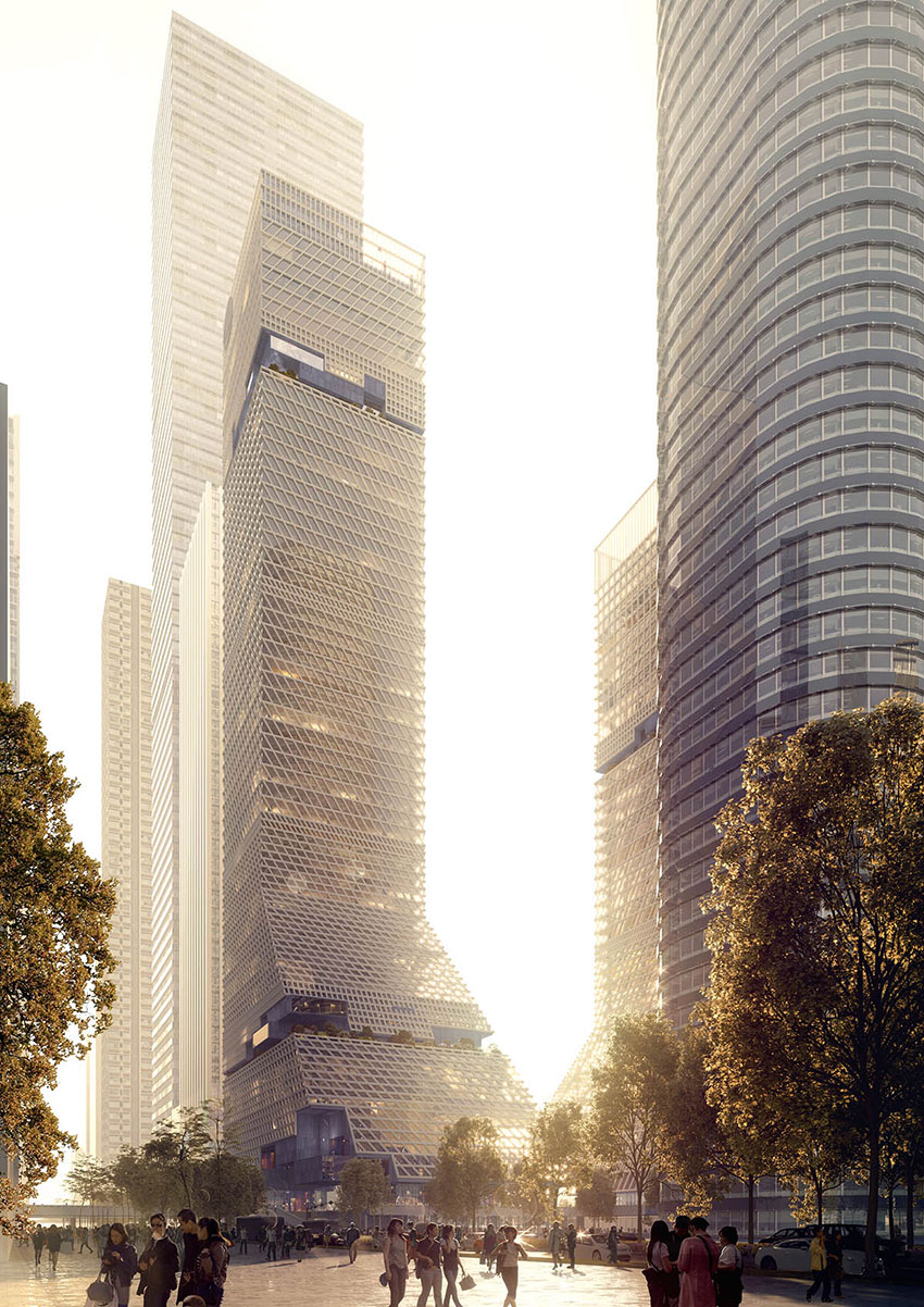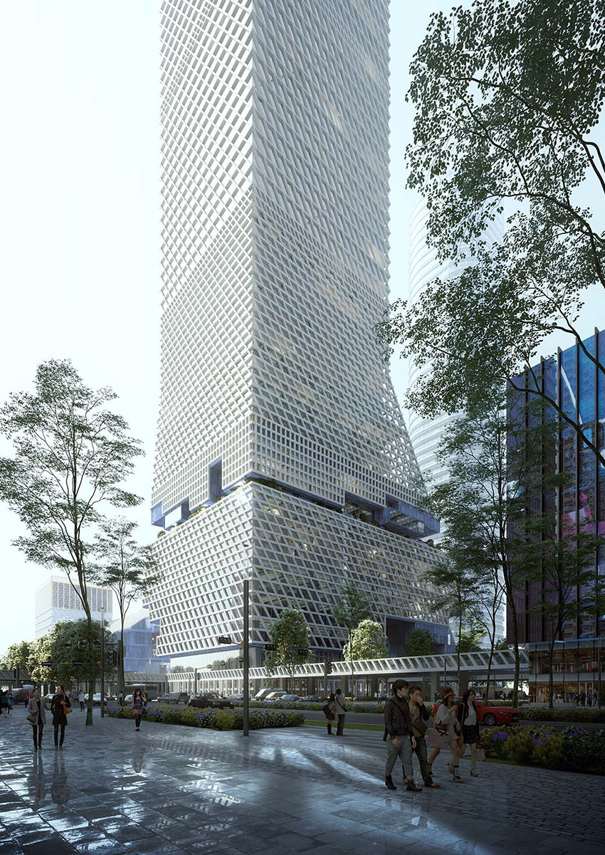 Холандска фирма Mecanoo представи своето предложение в конкурс за новата централа на China Merchants Bank в Шенжен. Проектът включва „театрална фасада“ с радиално оформената мрежа от ромбоиди.