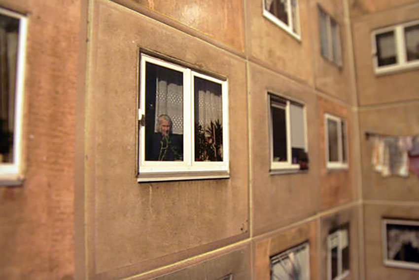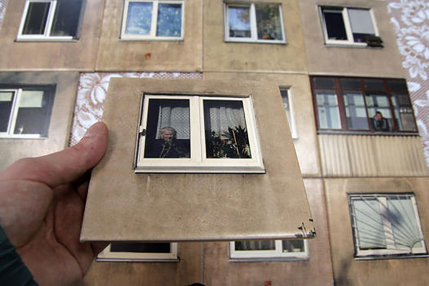 Студио Gyva Grafika получава поръчка за нов дизайн на бани в ресторант Galeria Urbana в Каунас, вторият по големина град в Литва. Собствениците обаче не са готови да свалят плочките от стените, така че дизайнерите предлагат компромис: залепване на стикери върху стените.  На стикерите са изобразени фасадите на реално съществуващи сгради в един от районите на града, както и надничащи зад завесите на прозорците жителите на града.