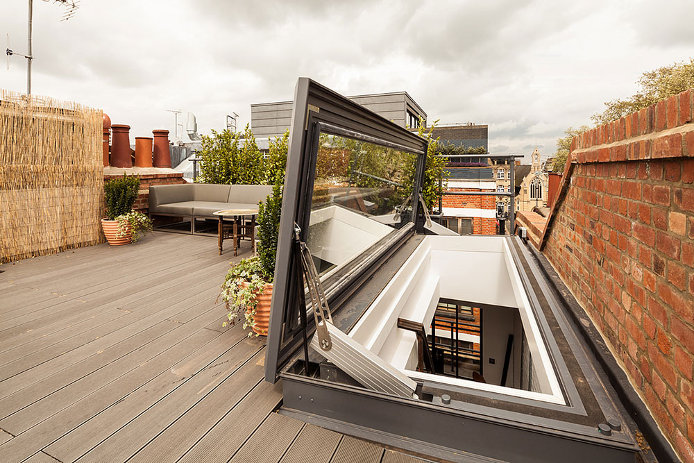 Skydoor от Glazing Vision е напълно остъклен покривен прозорец, отварящ се на панти, предназначен за лесен ежедневен достъп до покрива и идеален за покривни тераси.