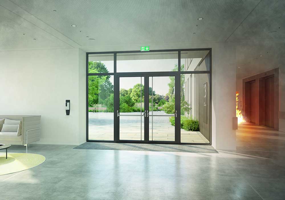 – Гъвкавост в дизайна: Възможност за интегриране на еднокрилни и двукрилни врати, остъкляване с различни видове пожарозащитно стъкло и комбиниране с други фасадни системи на Schüco.