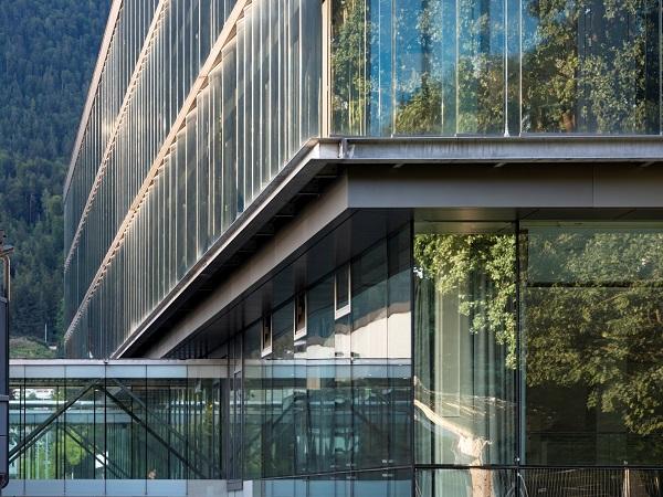 Ламинираното стъкло Guardian SunGuard® Solar Light Blue 52 играе решаваща роля във въздействието на фасадите на факултетите по архитектура и строителство в Университета в Инсбрук, Австрия. То намалява отблясъците от слънцето и подобрява топлоизолацията на сградата.