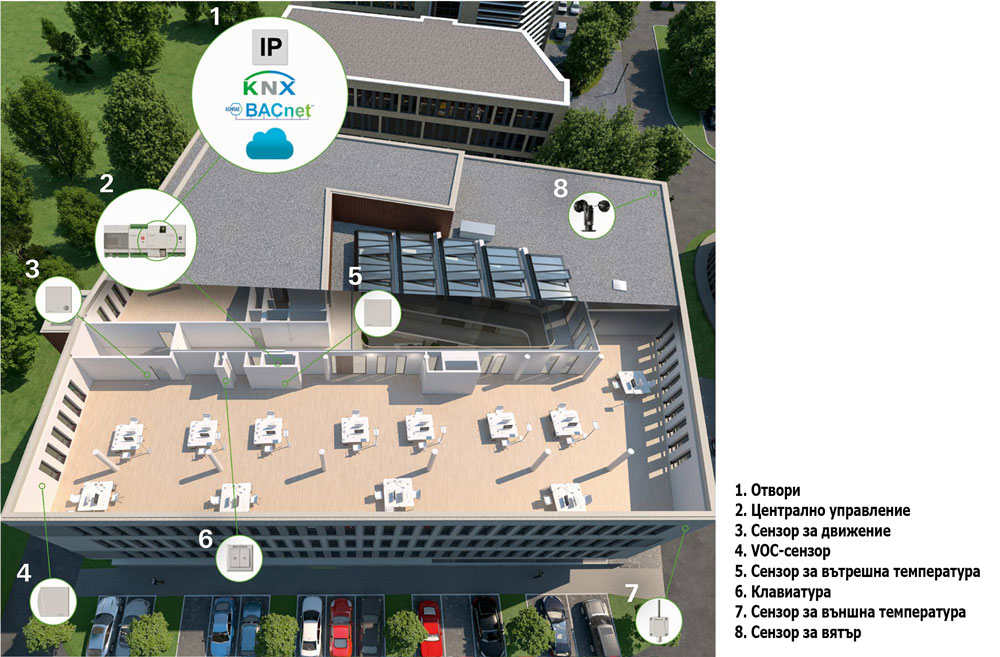 Наборът от сензори включва детектори за вятър и дъжд, вътрешни и външни температурни датчици, детектори за движение, както и датчици за качеството на вътрешния въздух (VOC).