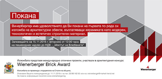 За първа година в София от 14-ти до 28-ми ноември на пешеходния надлез зад НДК – „Мостът на влюбените“ ще се представи изложба с 60 пана с архитектурни проекта на участници и победители от Wienerberger Brick Award 2016 – един от най-големите световни-архитектурни конкурси. На всеки две години над 300 архитекти се състезават за награден фонд в размер над 30 000 евро в 5 категории – жилищни сгради, обществени сгради, реконструкция, градски решения и специални решения, устойчивост и интеграция. Конкурсът има за цел да отличи най-добрите постижения на съвременната архитектура с акцент върху един от най-дълготрайните строителни материали – керамиката. Във всяко издание престижно международно жури определя победителите. През 2012 в него участваше и български архитект – арх. Пламен Братков.